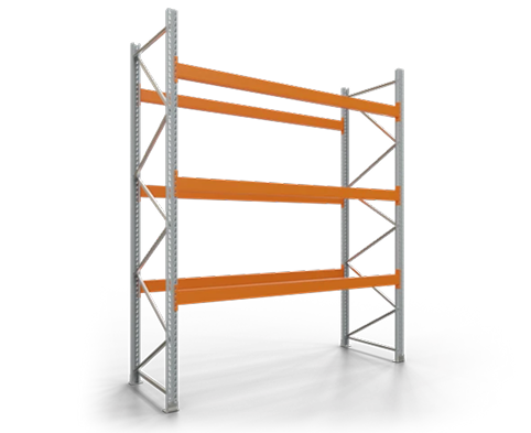 A complete pallet rack main bay is made up of at least two upright frames and four load beams. Additional bays can be attached using two beams, which are suspended between the upright frames. These beams are secured with locking pins to prevent accidental dislodging. The upright frames are reinforced with diagonal and horizontal braces made of galvanised C-profiles. For extra stability, the load beams can be connected using depth bars, and the length of the beams defines the bay length.